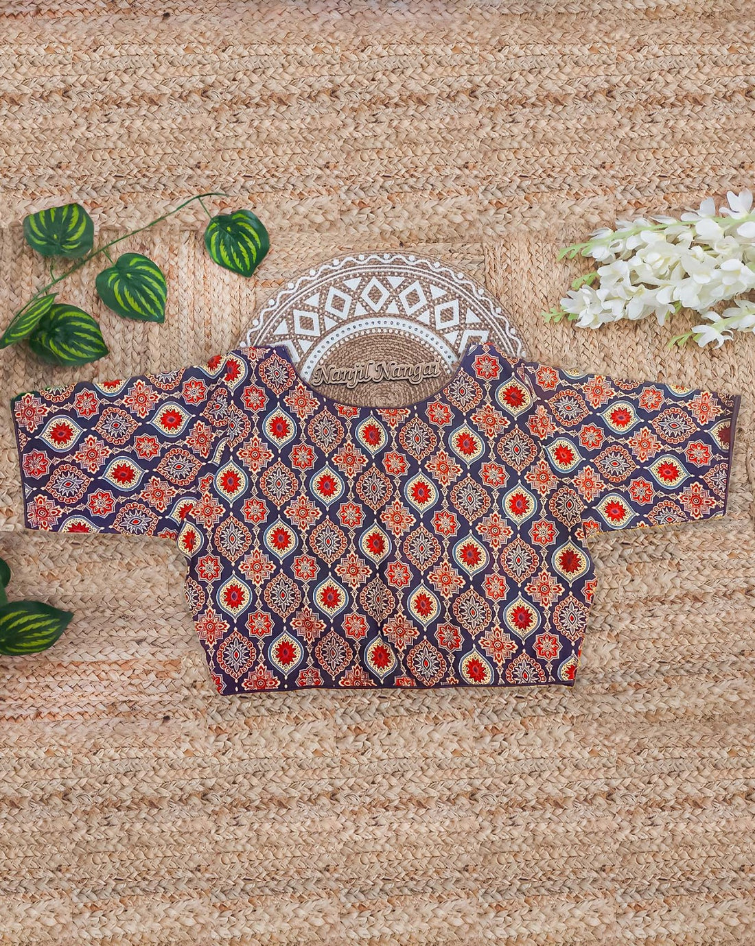 Blouse Description Experience authentic craftsmanship with this Pure Cotton Readymade Blouse, blending traditional block-print artistry...