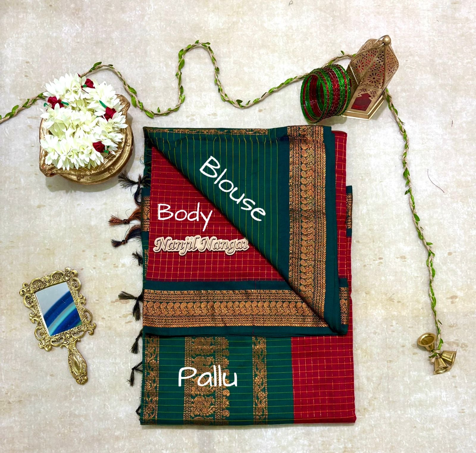 Crafted from finely spun cotton and handloom-woven using traditional techniques, with a classic checked pattern, Kalyani Cotton sarees offer the perfect blend of elegance and comfort. Their subtle sheen, smooth fall, and vibrant colour combinations make them a graceful choice for office wear, festive gatherings, and daily elegance.