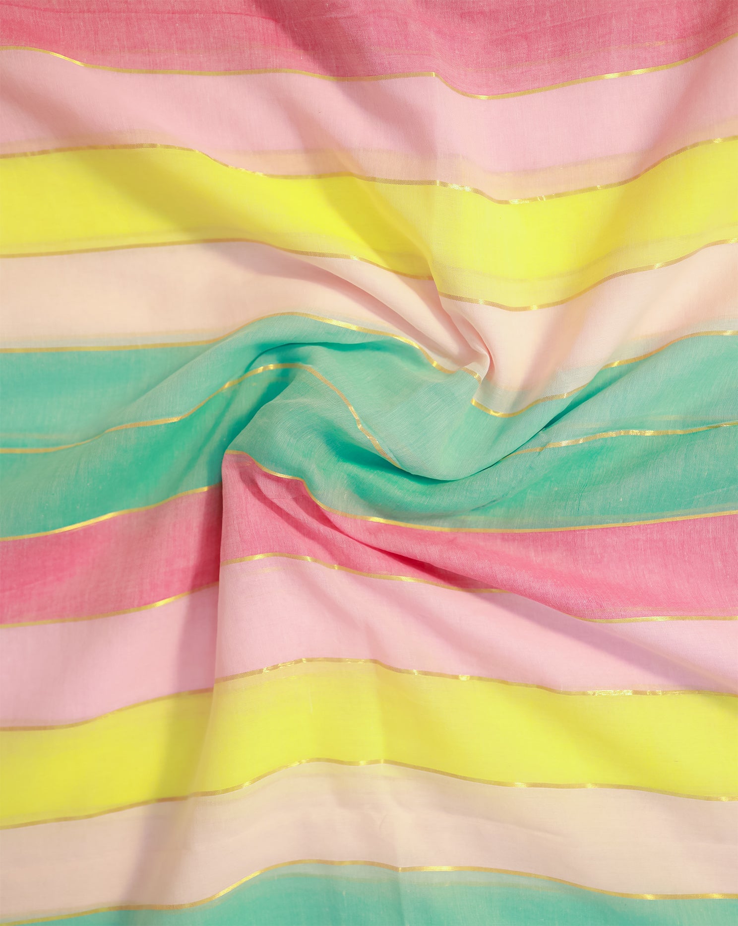 Expertly crafted from premium 120-count mul cotton, the Varnika saree blooms in soothing pastel multicolor tones with a soft, breathable texture. Finished with premium matching tassels that add a touch of elegance, it perfectly balances comfort and charm. Ideal for festive gatherings or effortless everyday wear, its lightweight drape and subtle radiance make it a timeless wardrobe favorite.
